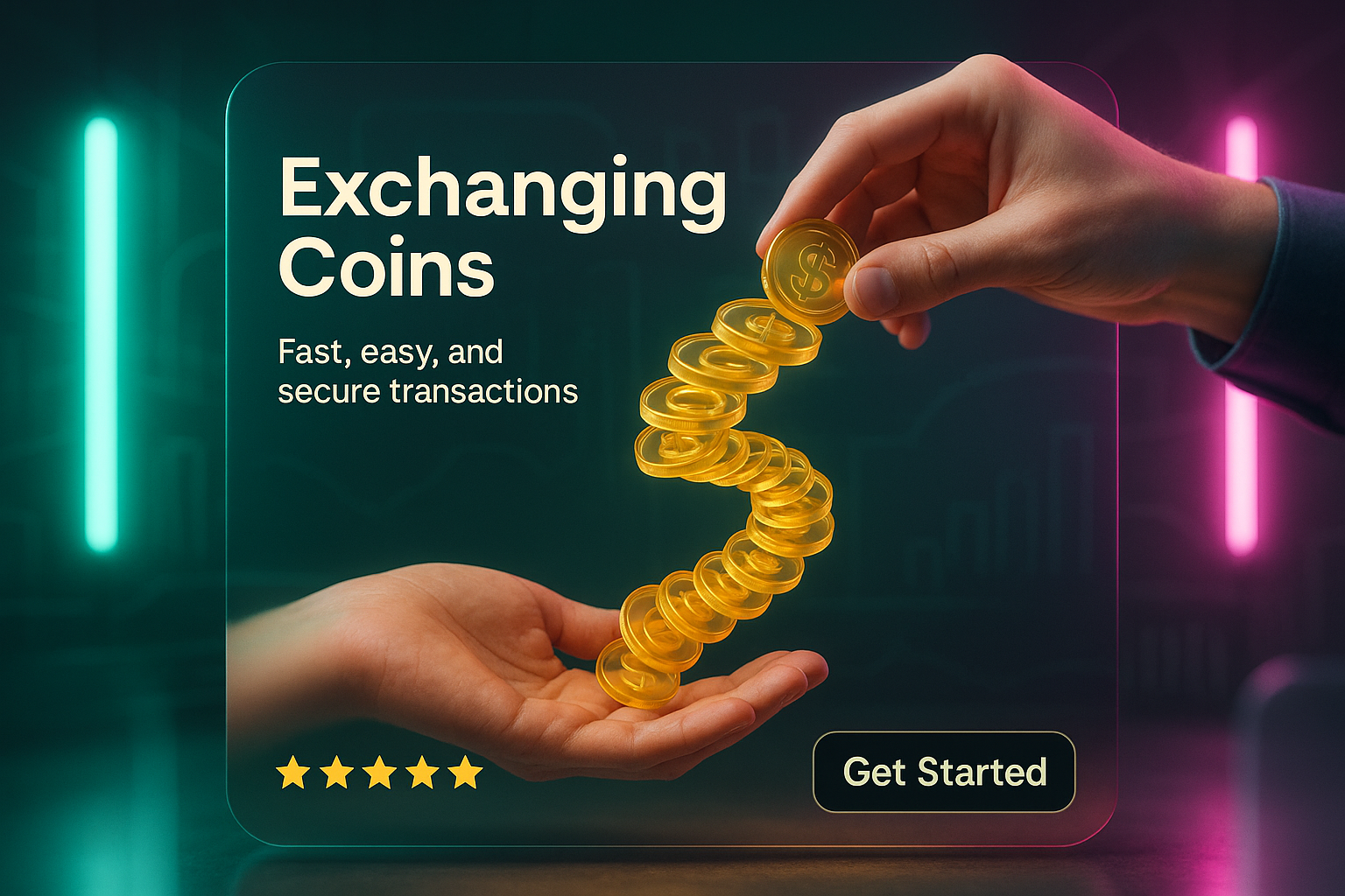 Modern promotional graphic featuring a dynamic coin exchange concept, designed for digital marketing to attract users to a financial service. The use of vibrant colors and a clean layout enhances visual appeal.
