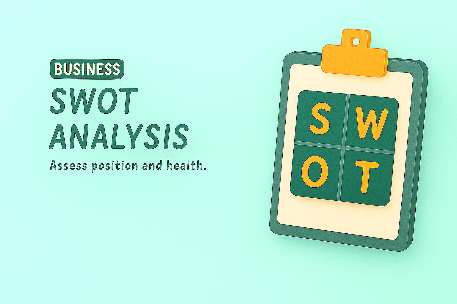 A modern and colorful graphic representing SWOT analysis with a clipboard design, ideal for business presentations and educational materials.