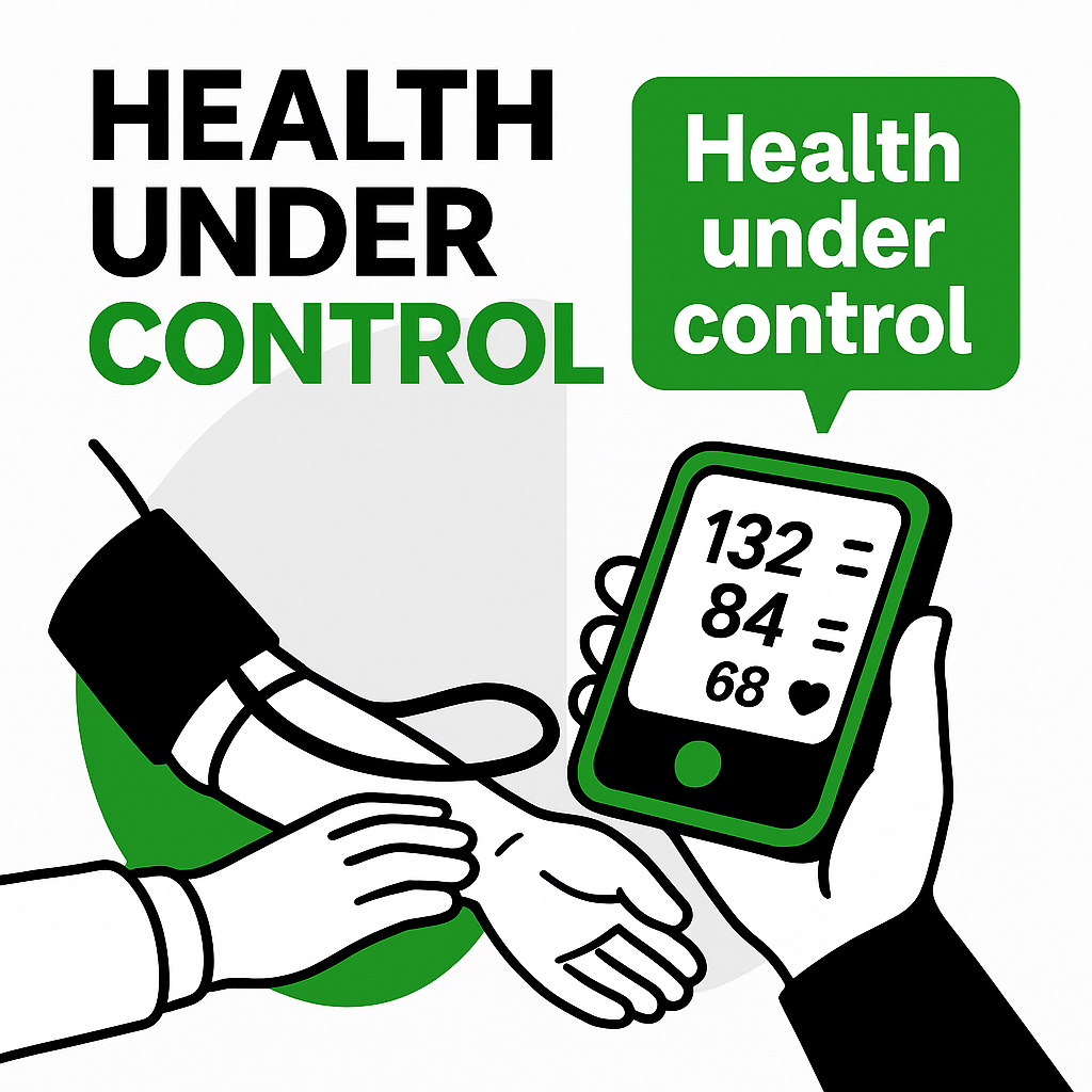 /Collection: /by davooda/Type: PNG/Illustrative graphic depicting health monitoring, featuring a mobile device displaying blood pressure readings alongside a hand measuring blood pressure, ideal for health-related campaigns.