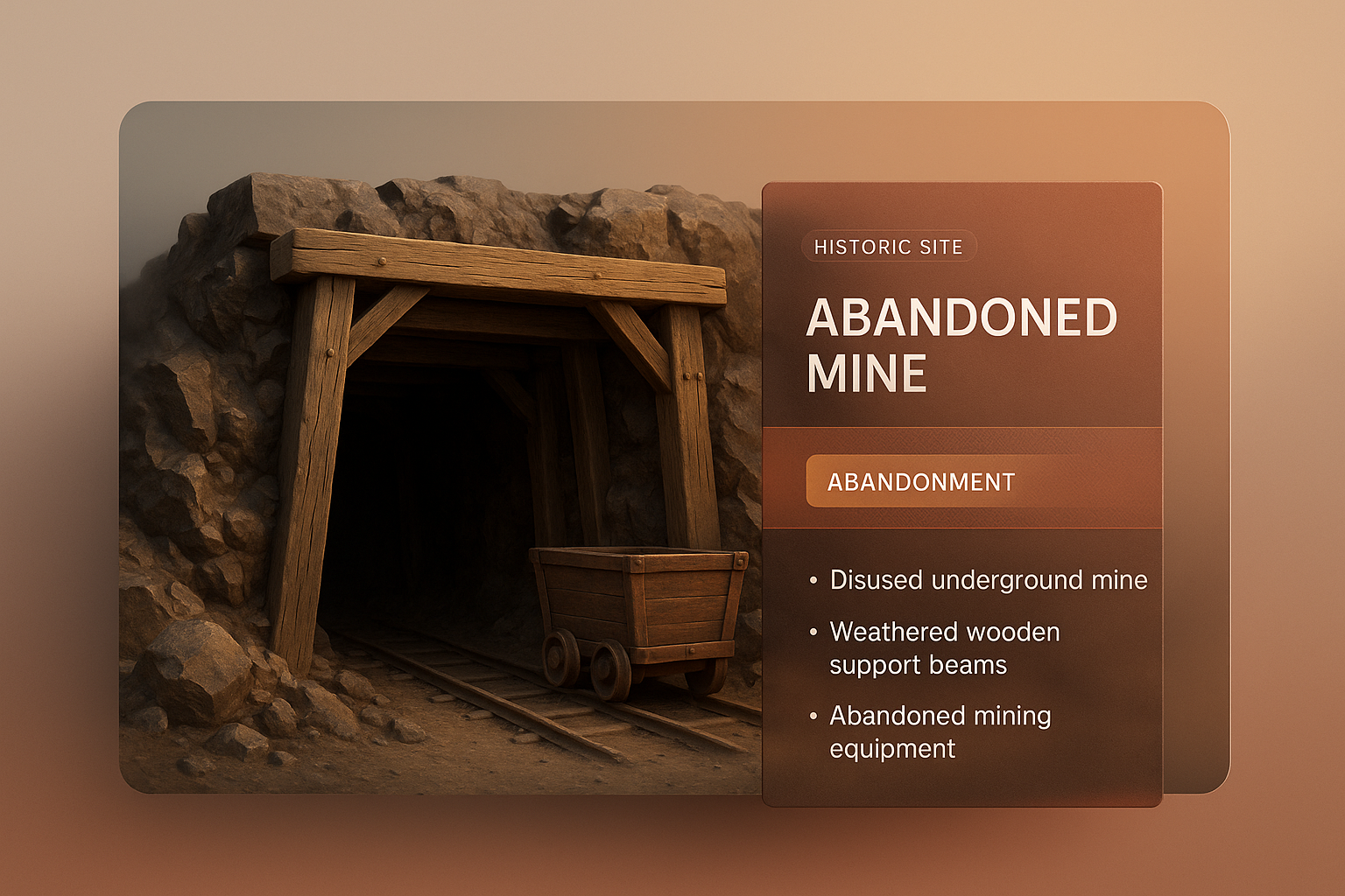 A 3D illustration of an abandoned mine entrance with wooden support beams and a mining cart, set against a smooth gradient background, highlighting the historical significance.