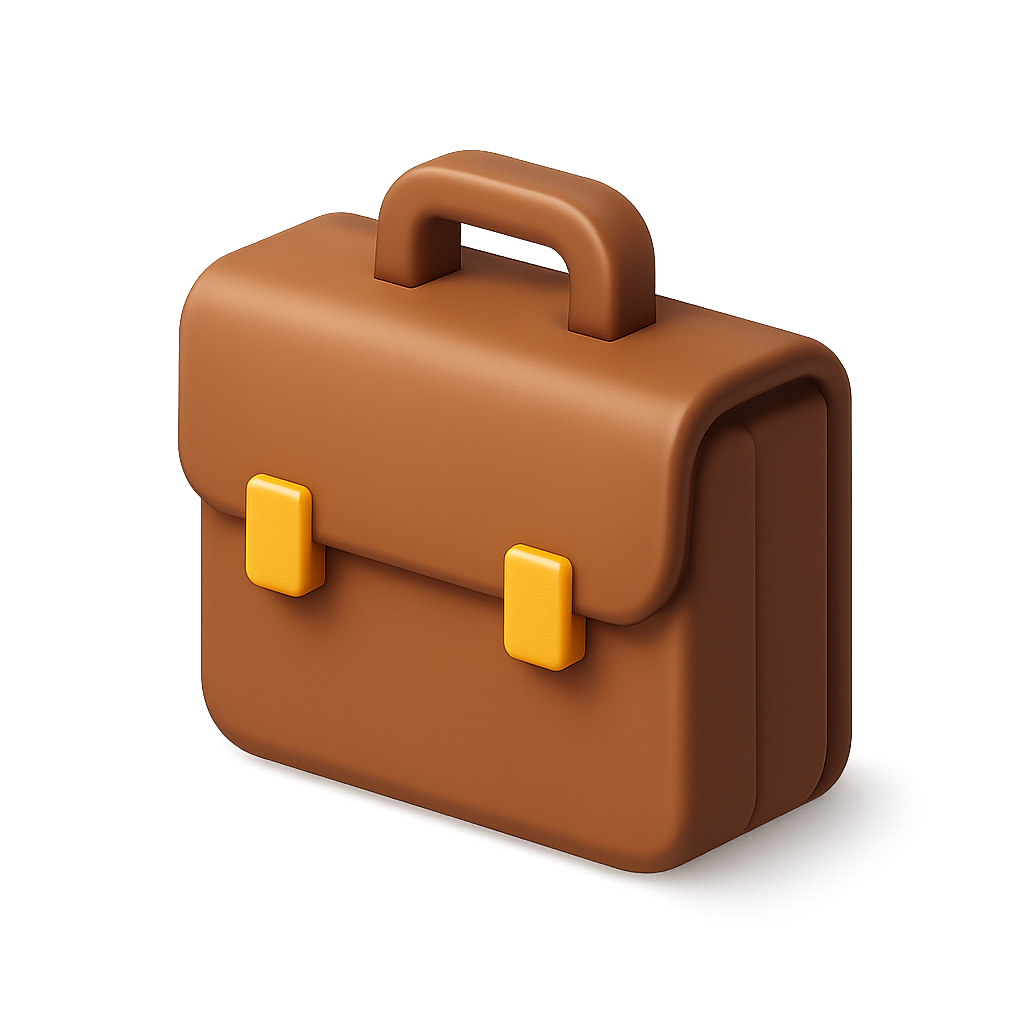 A 3D icon of a briefcase rendered in a three-quarter view. The briefcase features a brown color with yellow clasps, set against a subtle gradient background, emphasizing its volumetric design.