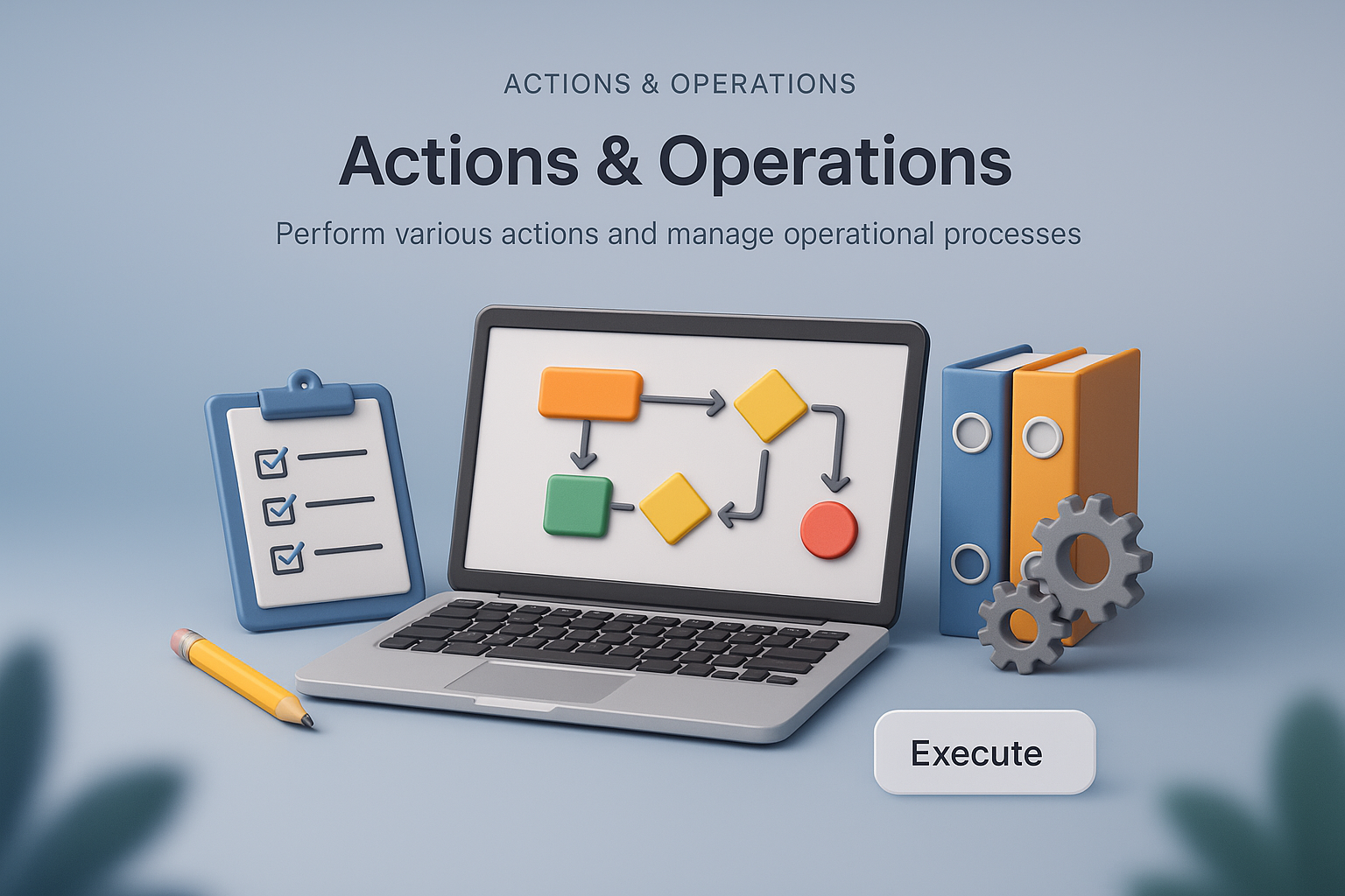 /Collection: /by davooda/Type: PNG/A realistic 3D illustration depicting a laptop with flowcharts, checklists, and gears, set against a smooth gradient background, showcasing actions and operations management.