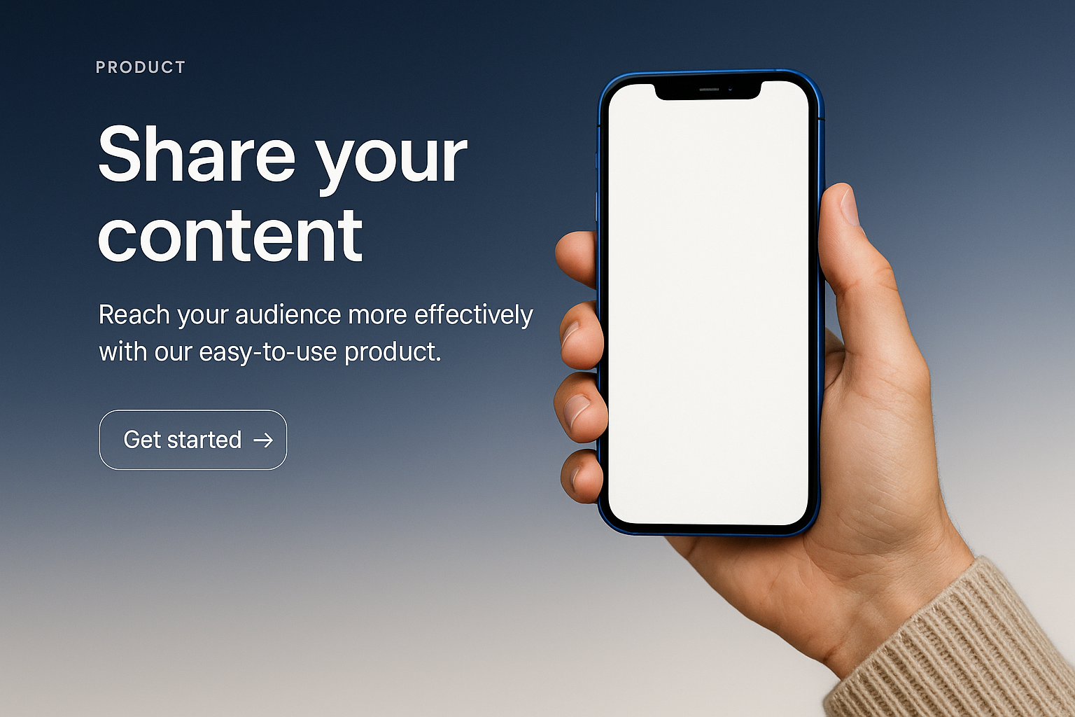 /Collection: /by davooda/Type: PNG/A hand holding a blue smartphone with a blank screen, set against a gradient background. The design emphasizes social media engagement with a clear call-to-action.