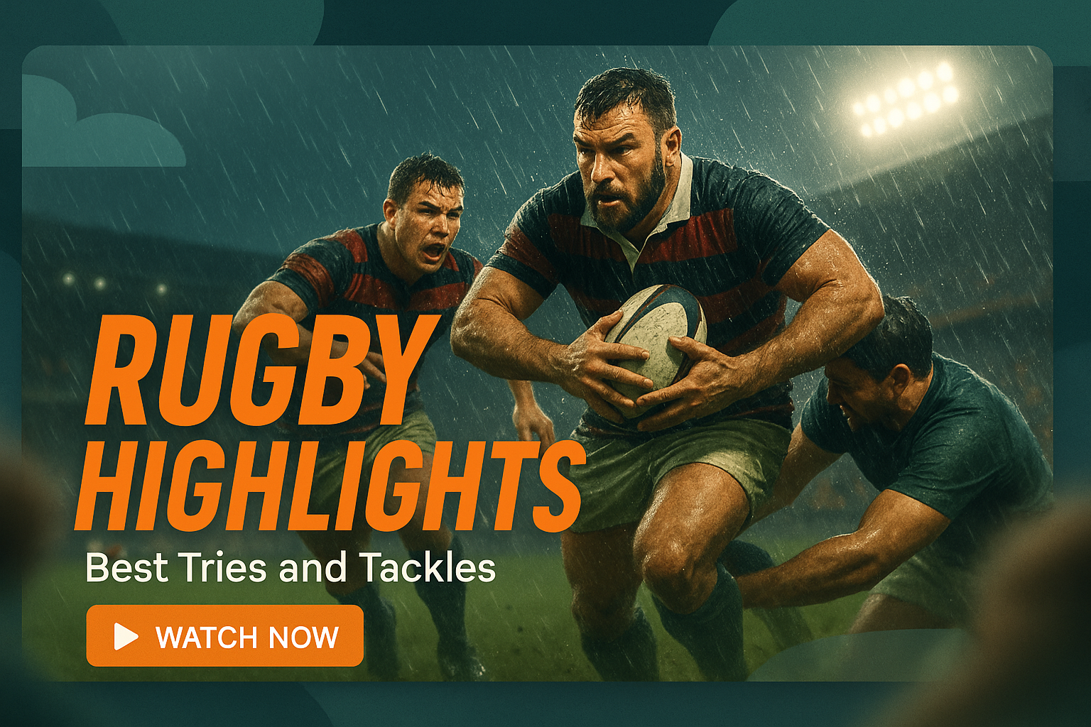 Vibrant promotional graphic showcasing rugby highlights, featuring intense action in a rainy setting. Ideal for sports marketing and video content promotion.