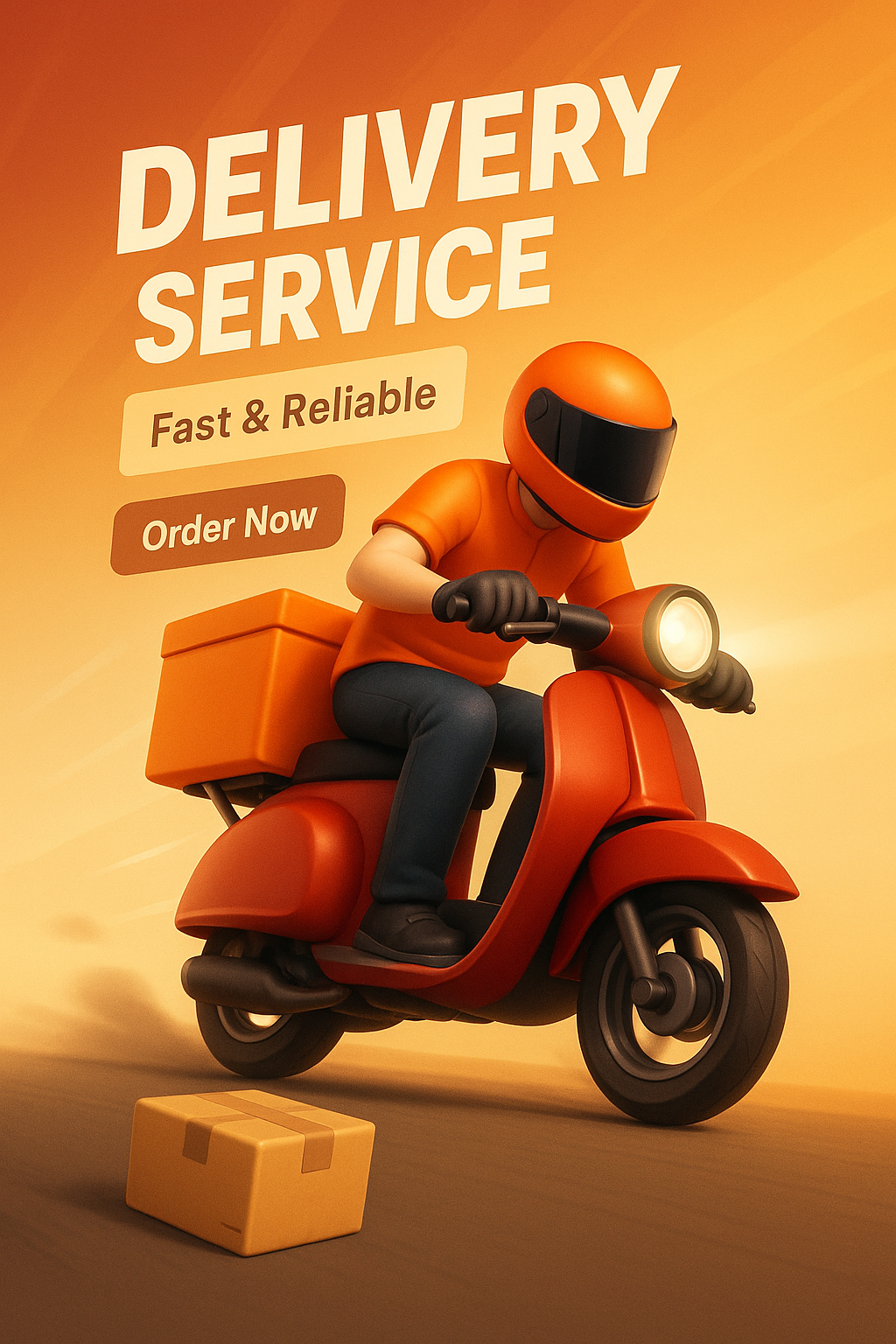 A colorful digital illustration depicting a delivery service theme, featuring a rider on a scooter. Ideal for promotional use in advertising campaigns.