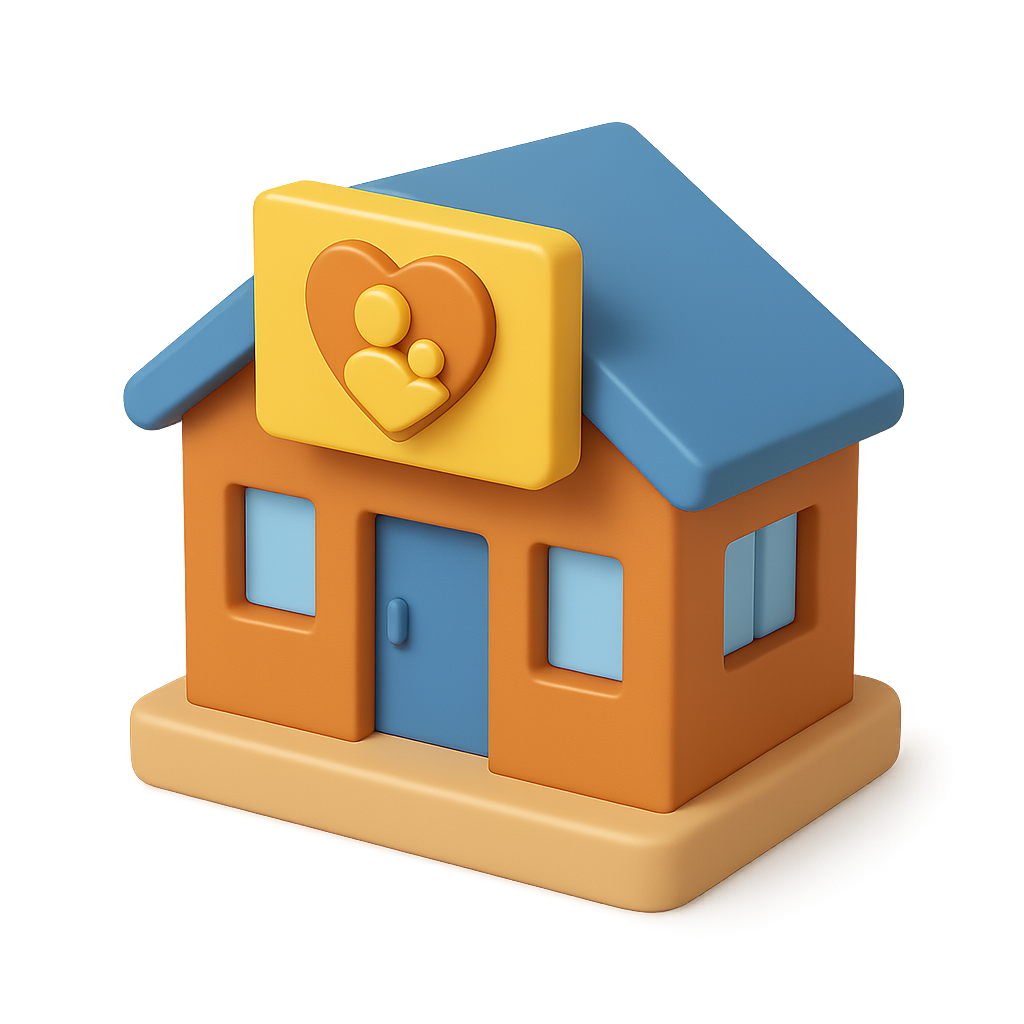A colorful 3D icon of an adoption center featuring a house structure with a heart symbol. The design includes vibrant colors and a volumetric, isometric look.