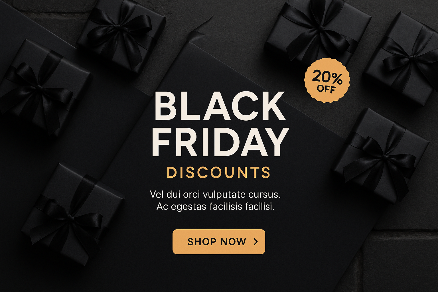 A visually striking arrangement of black gift boxes on a dark background, highlighting Black Friday discounts with a modern design and clear call to action.