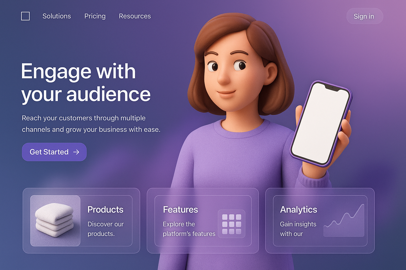 /Collection: /by davooda/Type: PNG/A modern landing page featuring a 3D character holding a smartphone. The design includes sections for products, features, and analytics with clear call-to-action buttons.