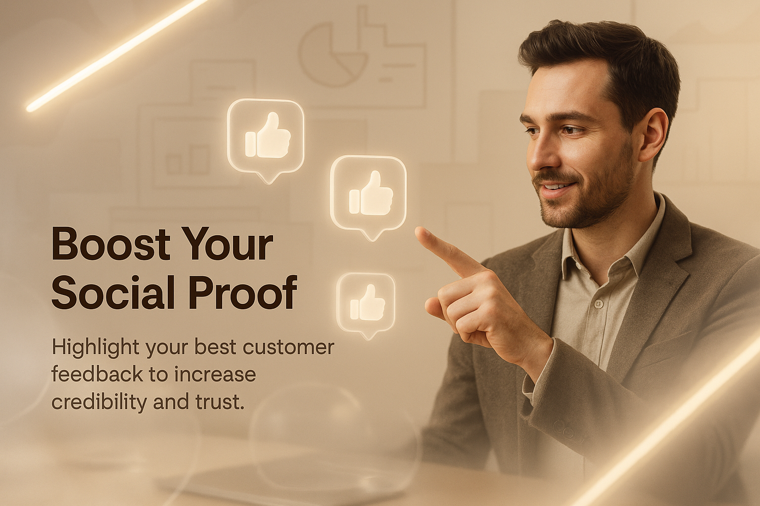 Modern promotional graphic featuring a professional man emphasizing customer feedback, designed to enhance social proof. Ideal for marketing materials.