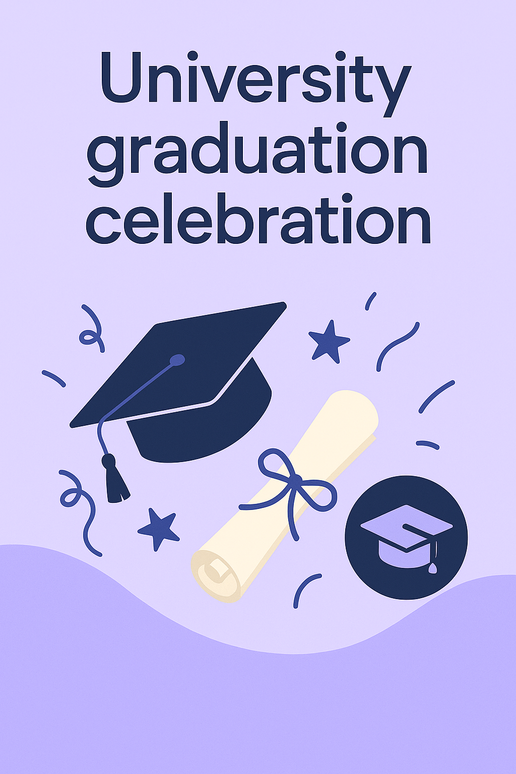 /Collection: /by davooda/Type: PNG/Colorful graphic celebrating university graduation, featuring a graduation cap, diploma, and celebratory elements, ideal for invitations or social media announcements.