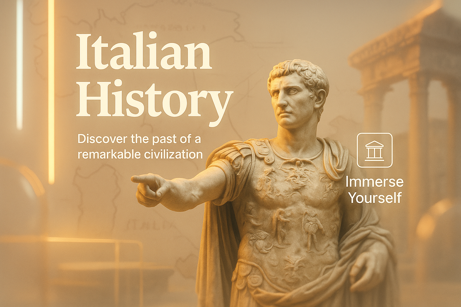 /Collection: /by davooda/Type: PNG/Elegant promotional graphic featuring a classical statue representing Italian history. Ideal for cultural events or educational programs, highlighting rich heritage and inviting engagement.