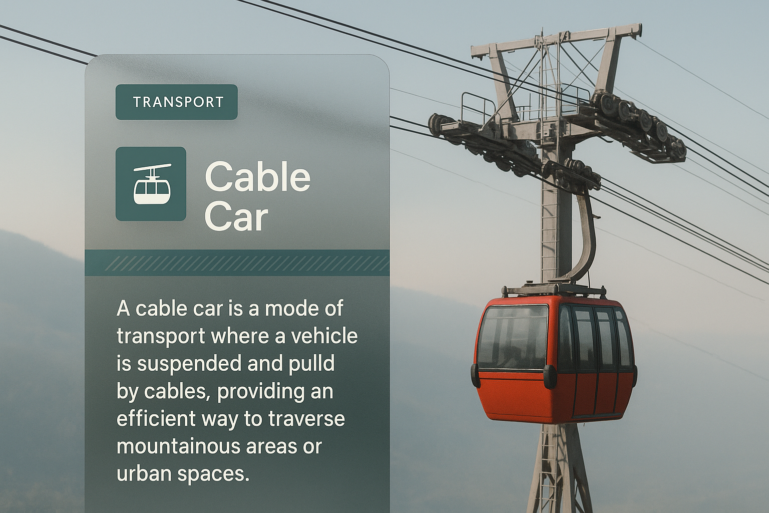 /Collection: /by davooda/Type: PNG/A vibrant cable car suspended in the air, integrated with a modern text block providing details about its function and design. The background is a smooth gradient, enhancing the visual appeal.