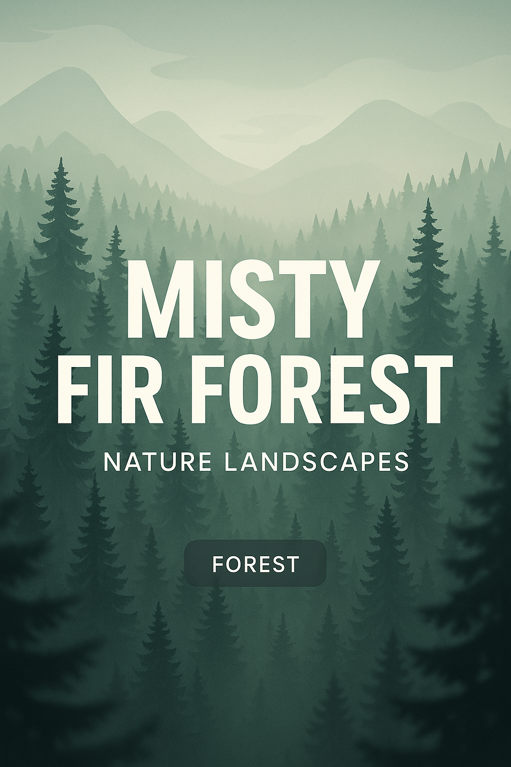 A serene digital illustration of a misty fir forest, showcasing layers of trees and mountains in a muted color palette, ideal for nature-themed projects.