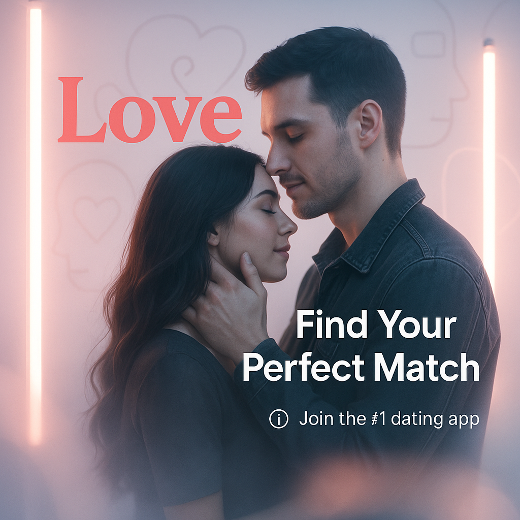 Engaging social media advertisement featuring a couple in a loving embrace, designed to promote a dating app. The soft lighting and modern aesthetic target young adults seeking relationships.