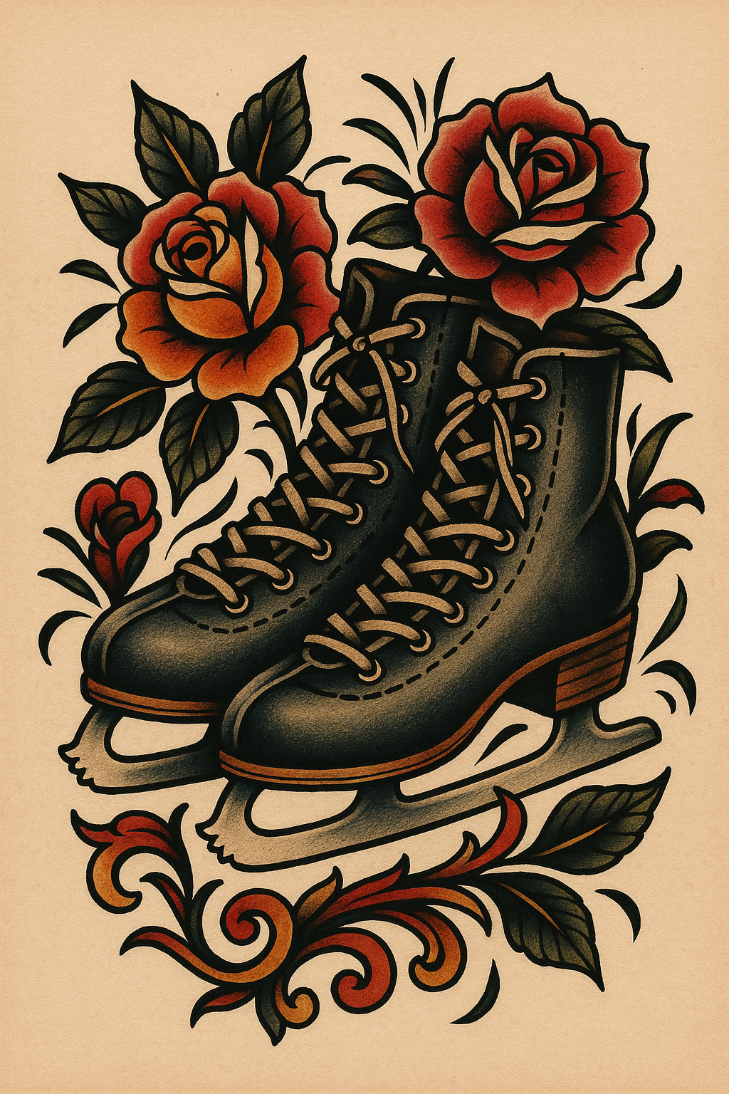 This image features a vintage-inspired tattoo design showcasing ice skates surrounded by vibrant roses. It's ideal for tattoo enthusiasts and ice skating fans.