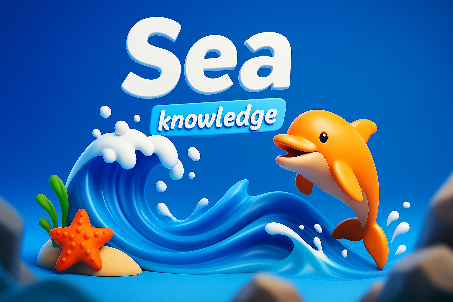 /Collection: /by davooda/Type: PNG/A vibrant 3D illustration featuring a dolphin jumping out of dynamic waves, complemented by a starfish and aquatic elements against a smooth blue background. Engaging typography enhances the scene.