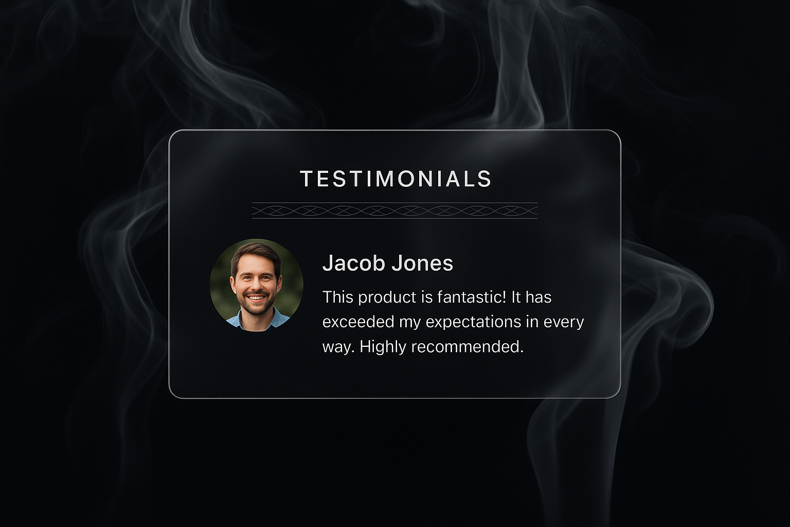 A testimonial card featuring a circular photo of Jacob Jones with a glowing testimonial text. Subtle smoke elements create a mystical effect on a dark background.