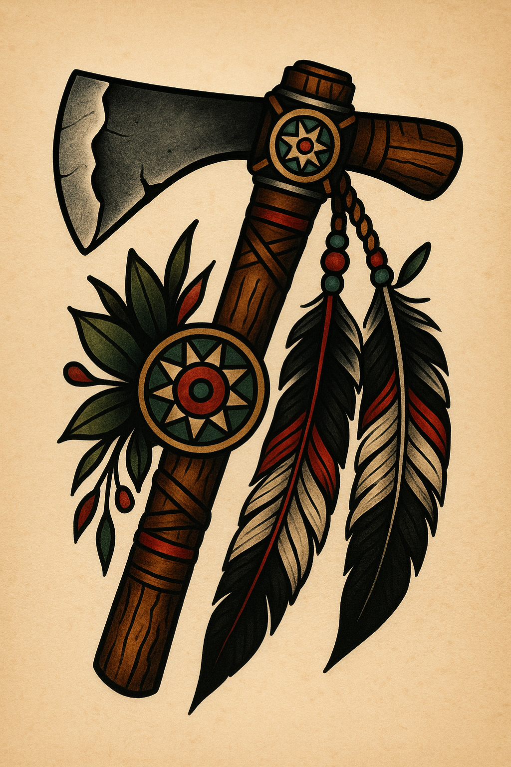 /Collection: /by davooda/Type: PNG/This image features a stylized illustration of a Native American axe adorned with feathers and decorative elements. It showcases vibrant colors and intricate designs, suitable for cultural art purposes.