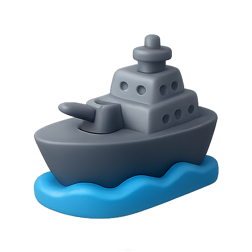 A minimalist 3D model of a gray toy ship resting on a blue water-like base, ideal for children's toys, educational materials, or playful branding.