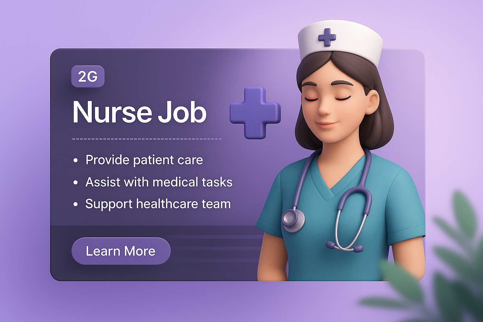 /Collection: /by davooda/Type: PNG/A visually striking 3D illustration featuring a nurse in scrubs with a stethoscope, set against a gradient background. The design includes a dark information block with details about the nurse's role.