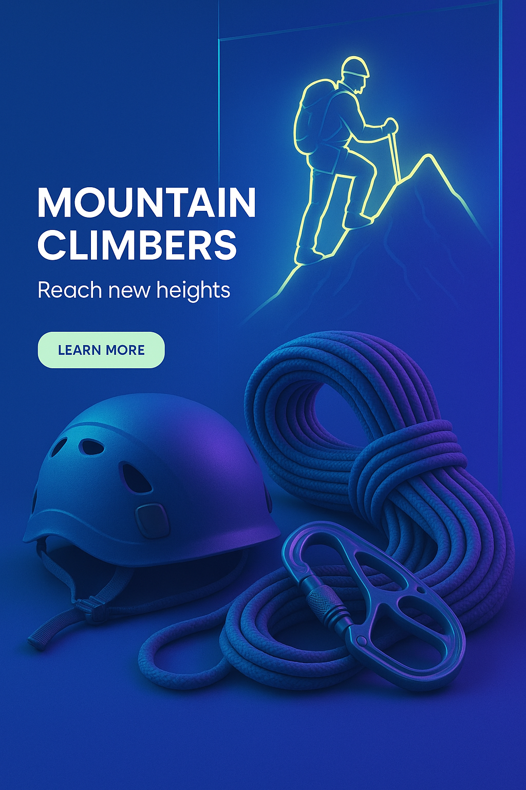 /Collection: /by davooda/Type: PNG/An artistic representation of mountain climbing featuring neon elements. A climber silhouette is highlighted against a blue background, with climbing gear like a helmet and rope in soft shadows, accented by glowing lines.