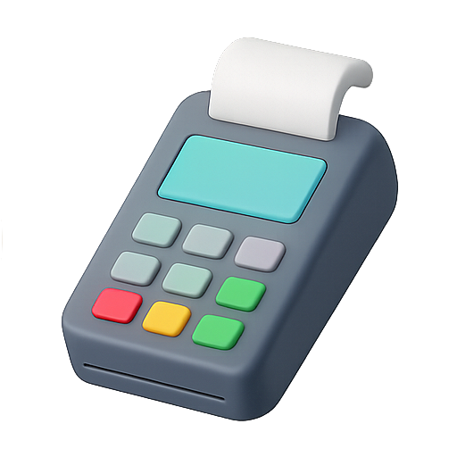 This 3D graphic depicts a modern payment terminal with colorful buttons and a paper roll, suitable for financial or retail-related content. Ideal for use in digital marketing and product presentations.
