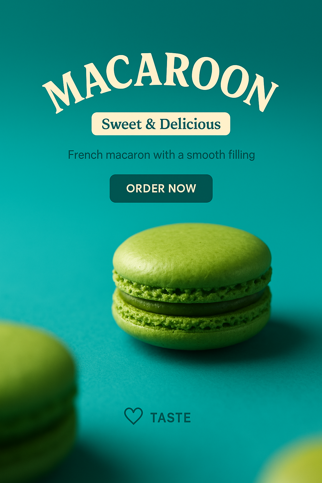 /Collection: /by davooda/Type: PNG/A visually appealing promotional graphic featuring a green macaron, ideal for social media or marketing to food enthusiasts. The design has a modern and inviting style.