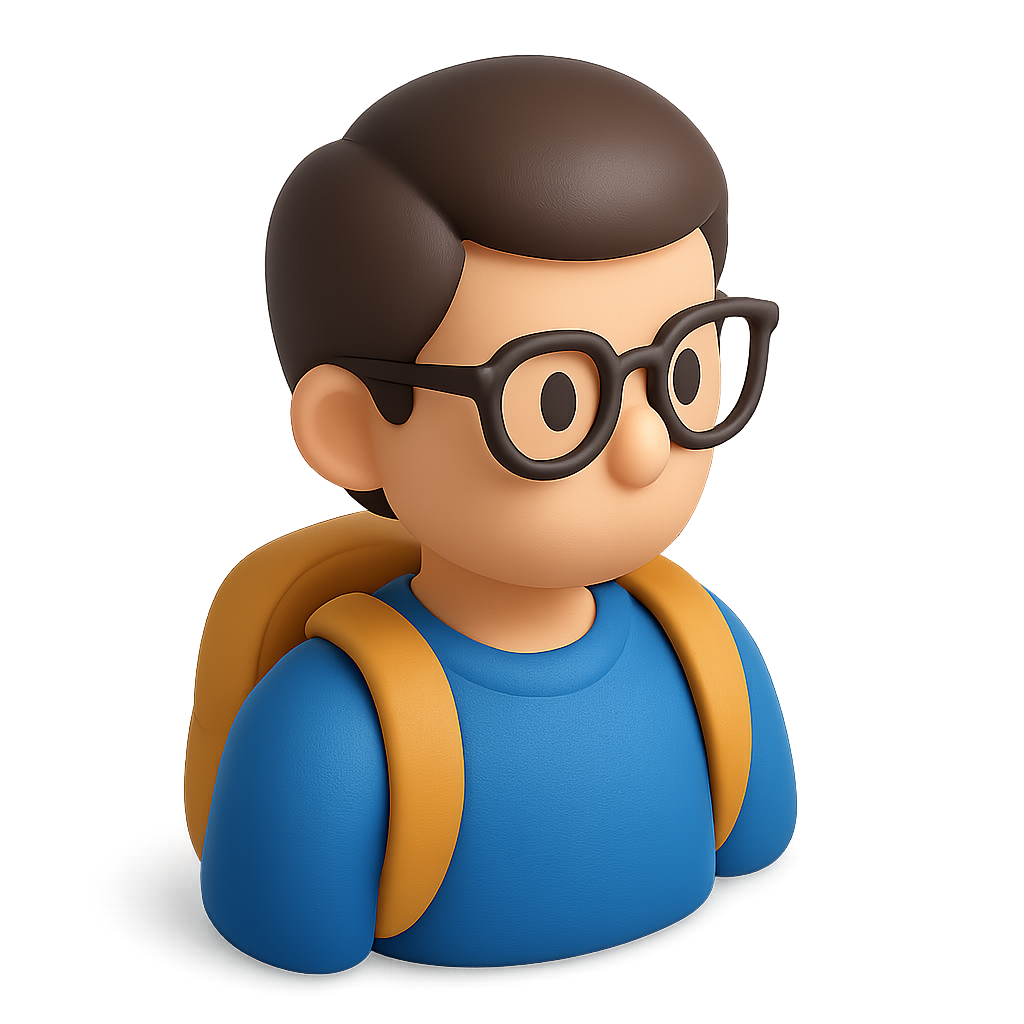 /Collection: /by davooda/Type: PNG/A stylized 3D pupil icon featuring a character with glasses and a backpack, rendered in a three-quarter view. The design has a smooth, volumetric feel against a gradient background.
