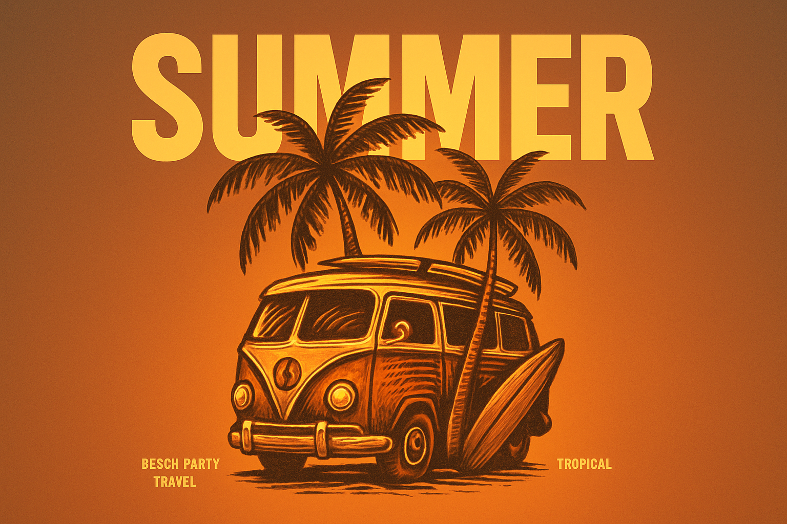 /Collection: /by davooda/Type: PNG/A vibrant design featuring a vintage van with surfboards, flanked by palm trees. The bold 'SUMMER' text dominates the upper half, creating a striking visual impact.