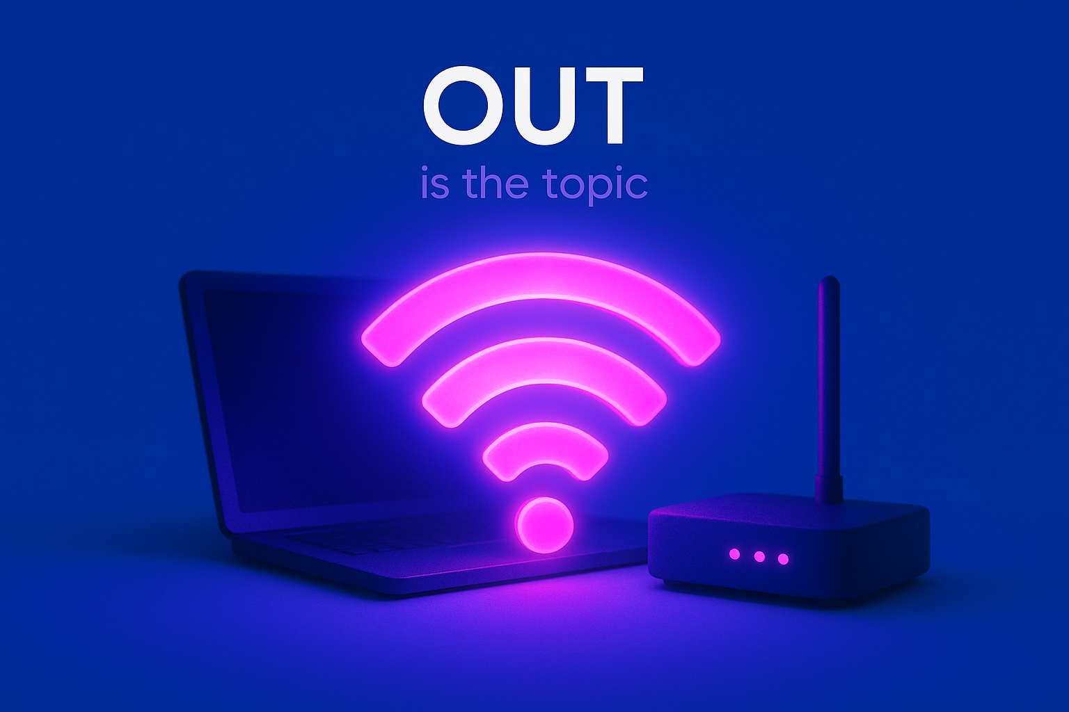 A captivating digital composition featuring a glowing pink Wi-Fi symbol above a laptop and router, set against a solid blue background. The neon glow creates an ethereal atmosphere.