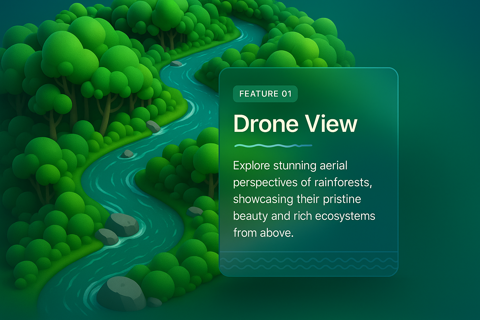 Aerial view of a winding river through a vibrant rainforest, showcasing lush greenery and rocks. A feature block highlights the drone view aspect, enhancing visual appeal.