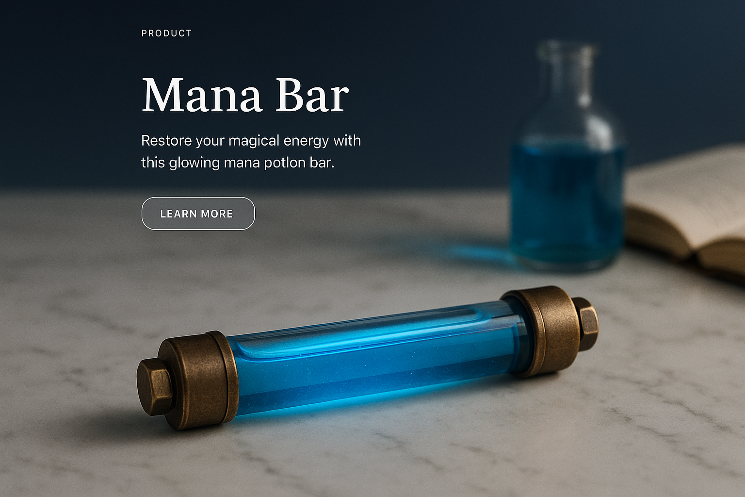 A visually striking representation of a mana pot bar, featuring a glowing blue liquid in a stylish container. The design includes a clear call-to-action button and well-structured text elements.