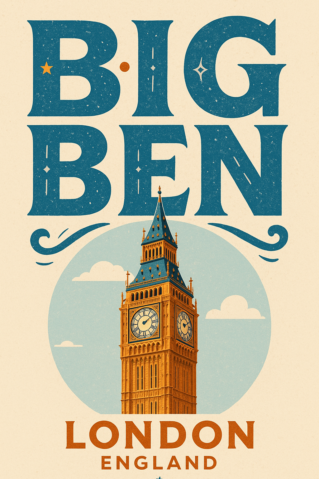 /Collection: /by davooda/Type: PNG/Creative poster featuring a stylized depiction of Big Ben with bold typography, perfect for travel enthusiasts and decor. The vintage design appeals to fans of iconic landmarks.