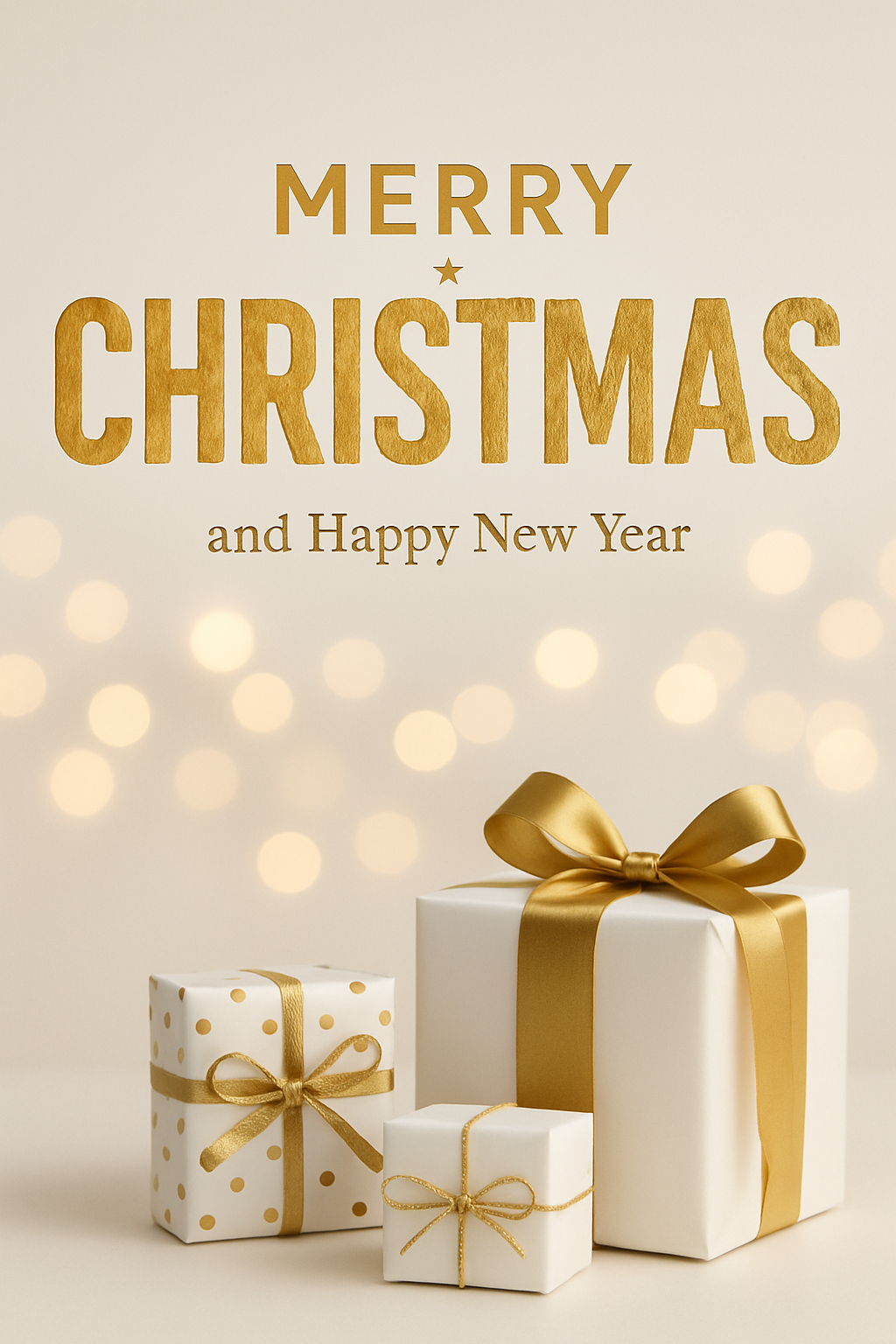 Charming holiday greeting card featuring beautifully wrapped gifts with gold accents, perfect for seasonal celebrations and festive wishes.
