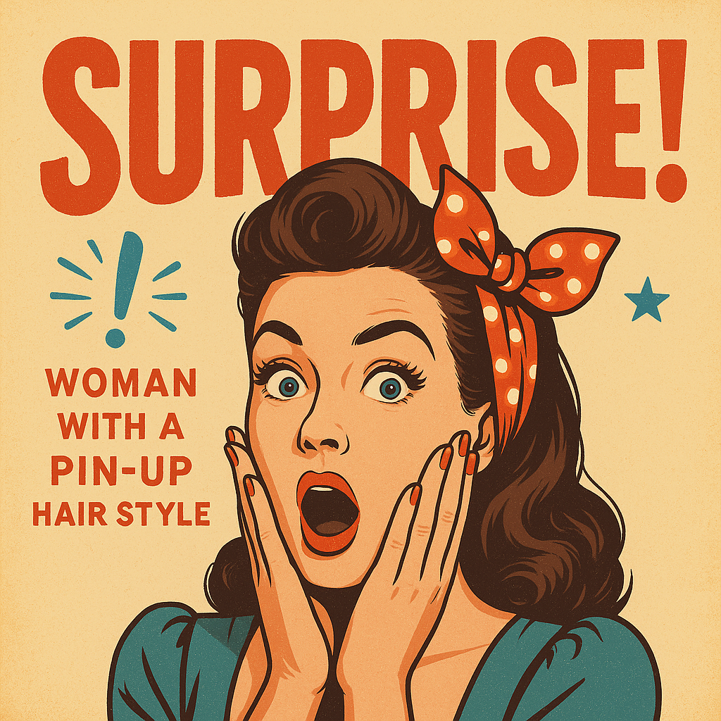 A vibrant retro-style graphic showcasing a surprised woman with a pin-up hairstyle, perfect for social media posts or promotional materials.