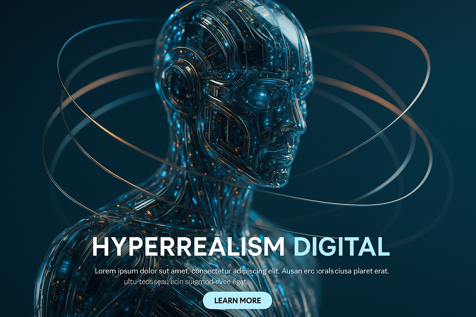 /Collection: /by davooda/Type: PNG/A hyperrealistic close-up of a figure surrounded by glowing digital orbits, showcasing intricate circuit details and reflective metallic surfaces. The background features a soft gradient, enhancing the luminous elements.