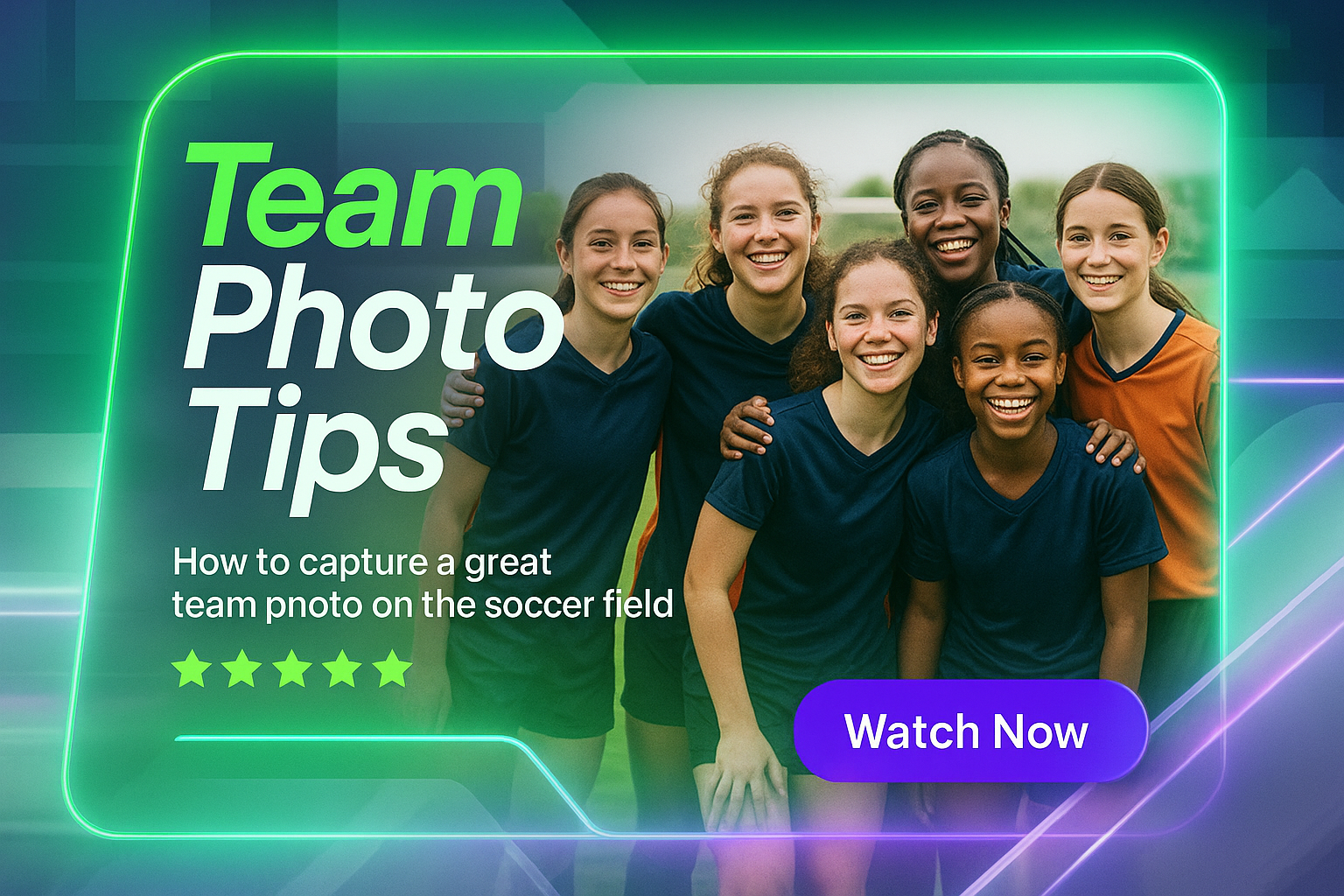 Vibrant social media post featuring a group of girls in soccer uniforms, designed to promote tips on capturing team photos. Suitable for sports photography enthusiasts.