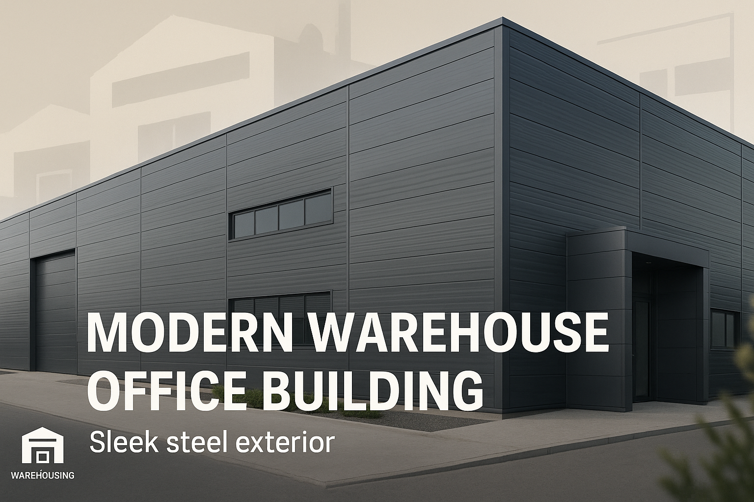 /Collection: /by davooda/Type: PNG/Architectural image showcasing a sleek steel exterior of a modern warehouse office building, ideal for real estate marketing or architectural presentations.