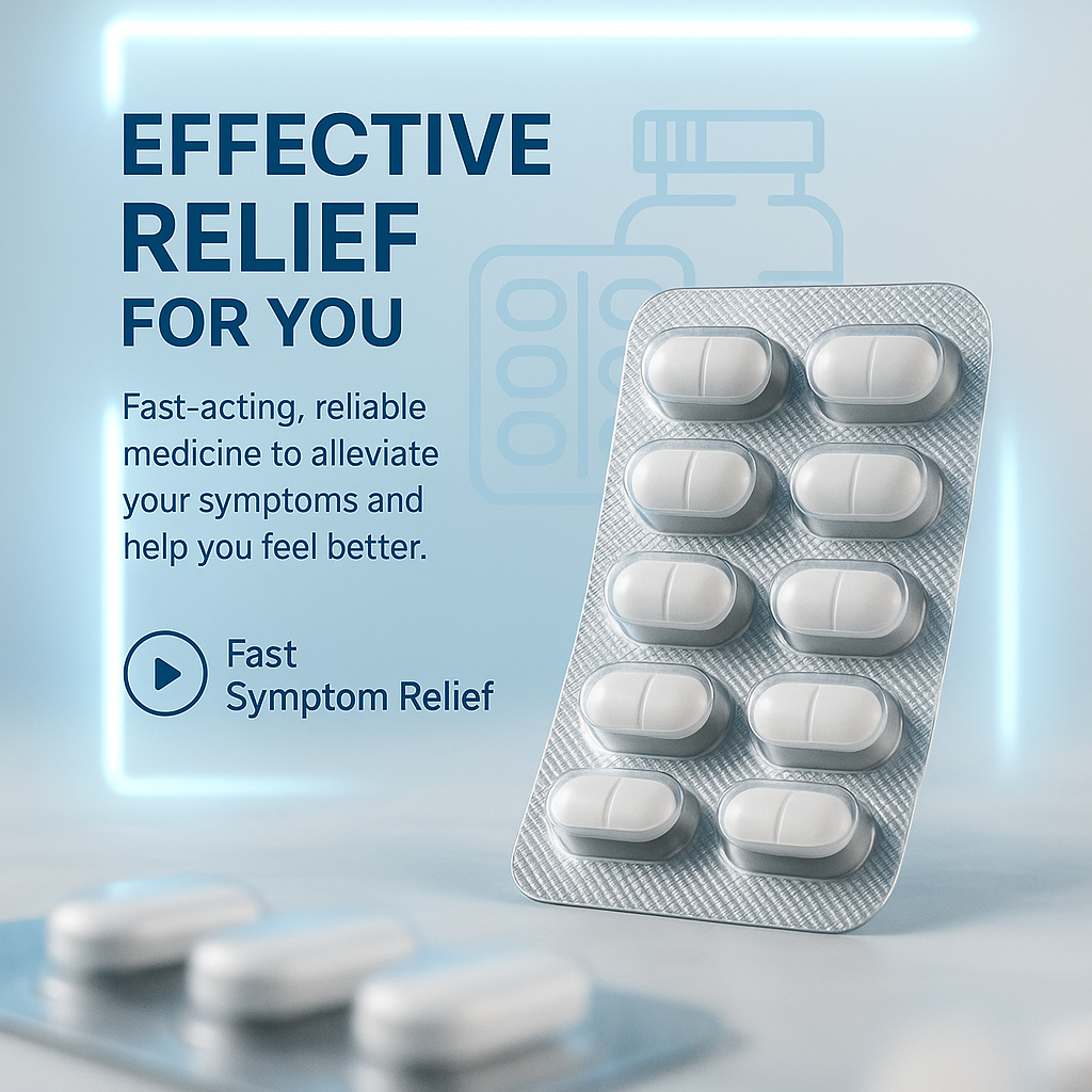 Product packaging design for over-the-counter medication, featuring a clean and modern aesthetic. Ideal for pharmaceutical marketing and promotion.