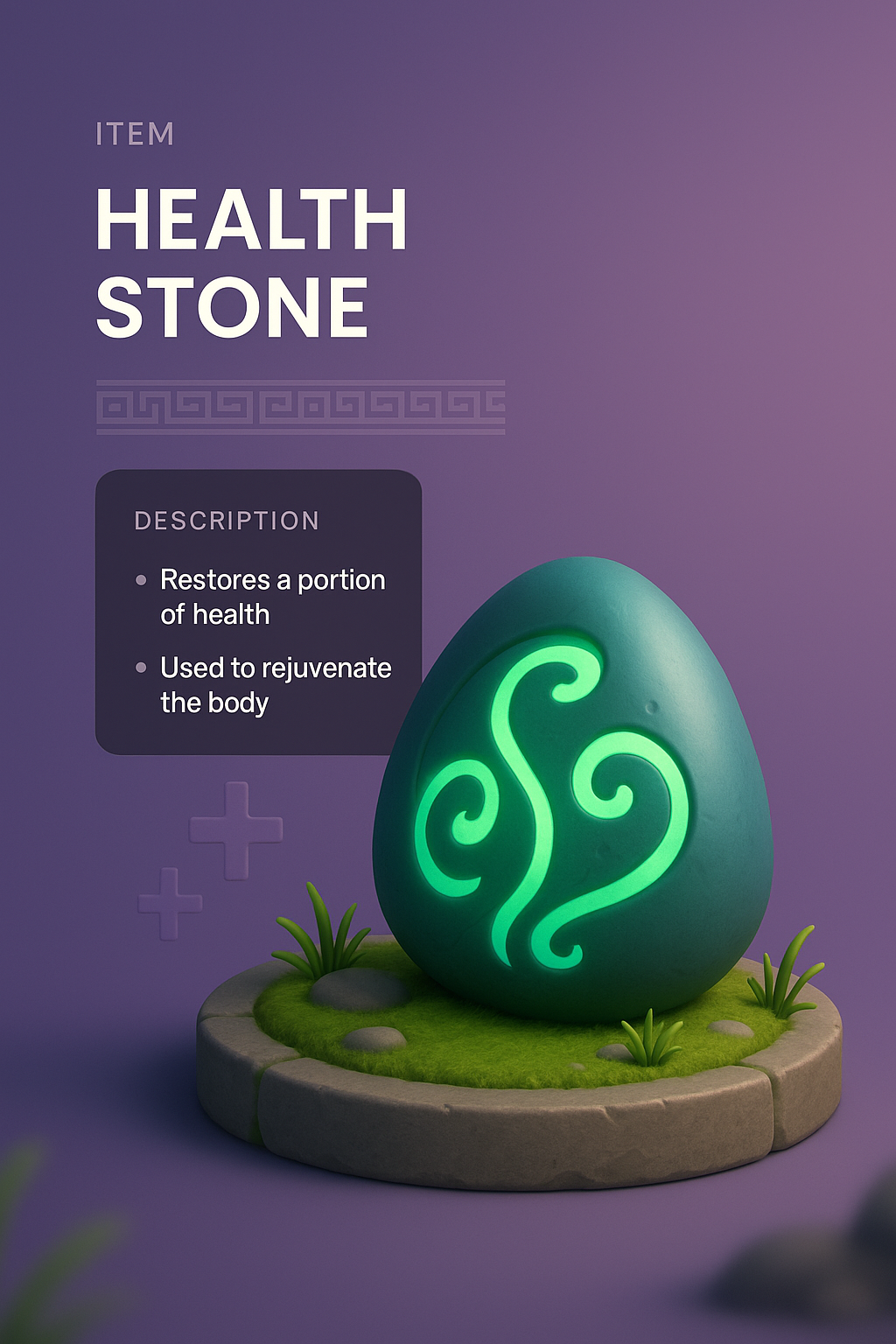 A visually striking 3D illustration of a health stone, featuring glowing patterns. The design includes a gradient background, integrated text blocks, and decorative elements for depth.