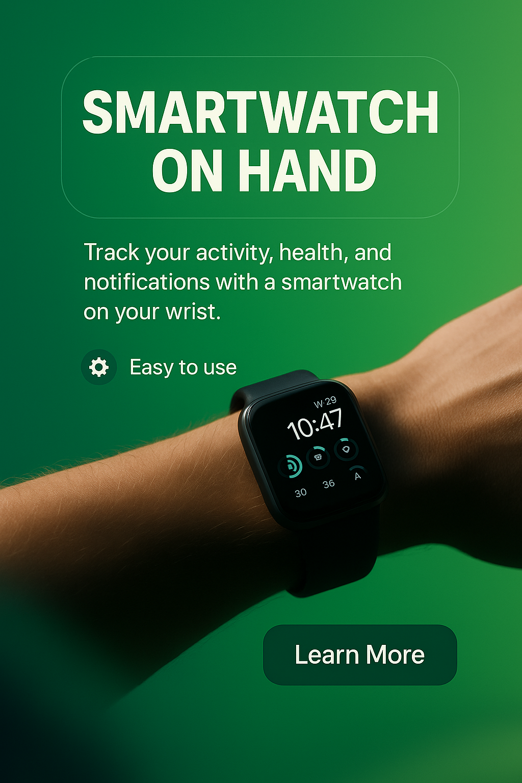 /Collection: /by davooda/Type: PNG/This is a promotional graphic showcasing a smartwatch on a wrist. The design features a modern aesthetic with a green background, emphasizing usability and health tracking.
