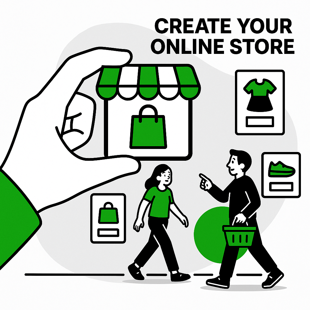 A modern, illustrative graphic depicting the concept of creating an online store. It features characters engaging with shopping elements, ideal for e-commerce marketing.