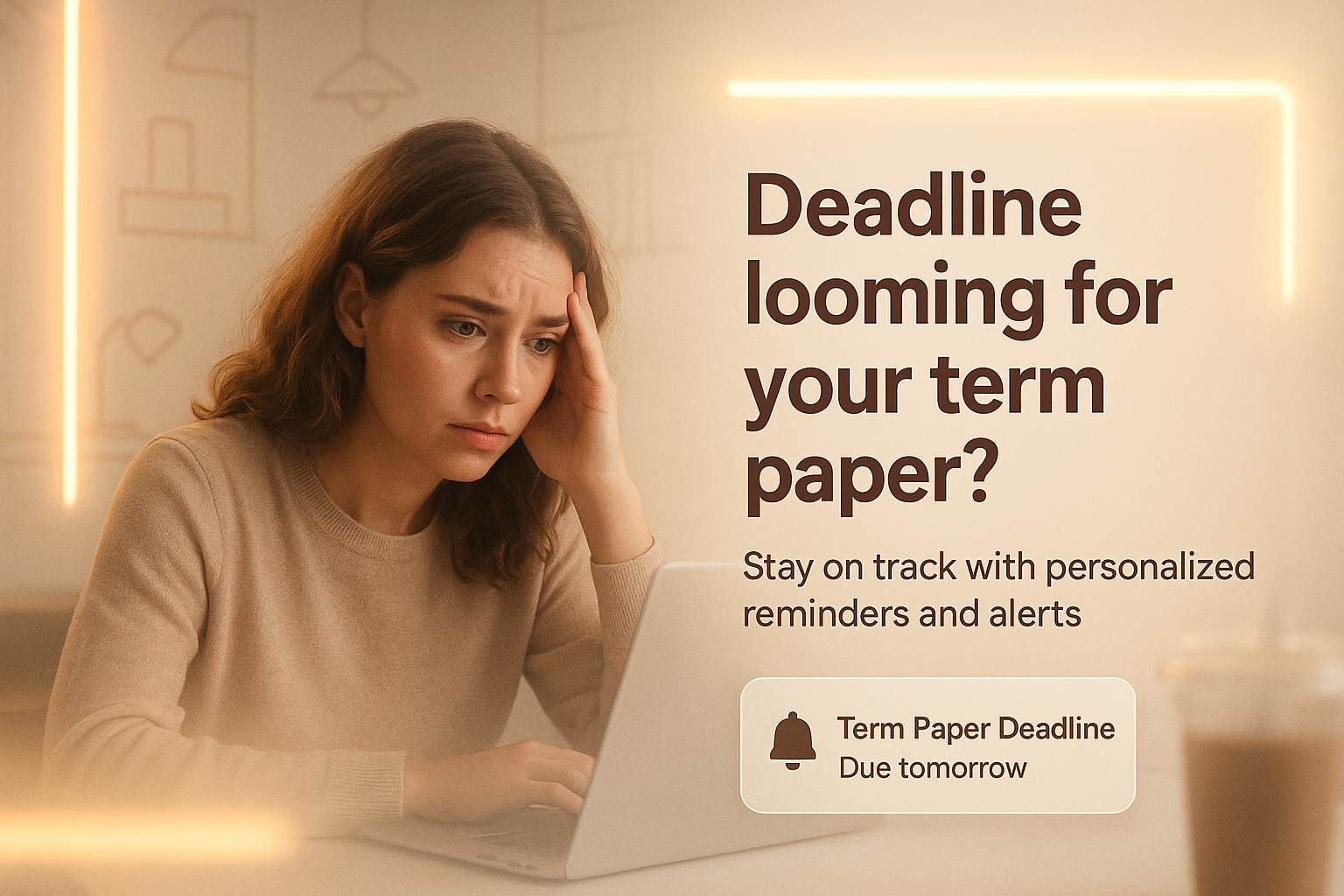 /Collection: /by davooda/Type: PNG/A visually engaging graphic depicting a concerned student working on a term paper, highlighting the importance of deadlines with a modern design, suitable for educational platforms.