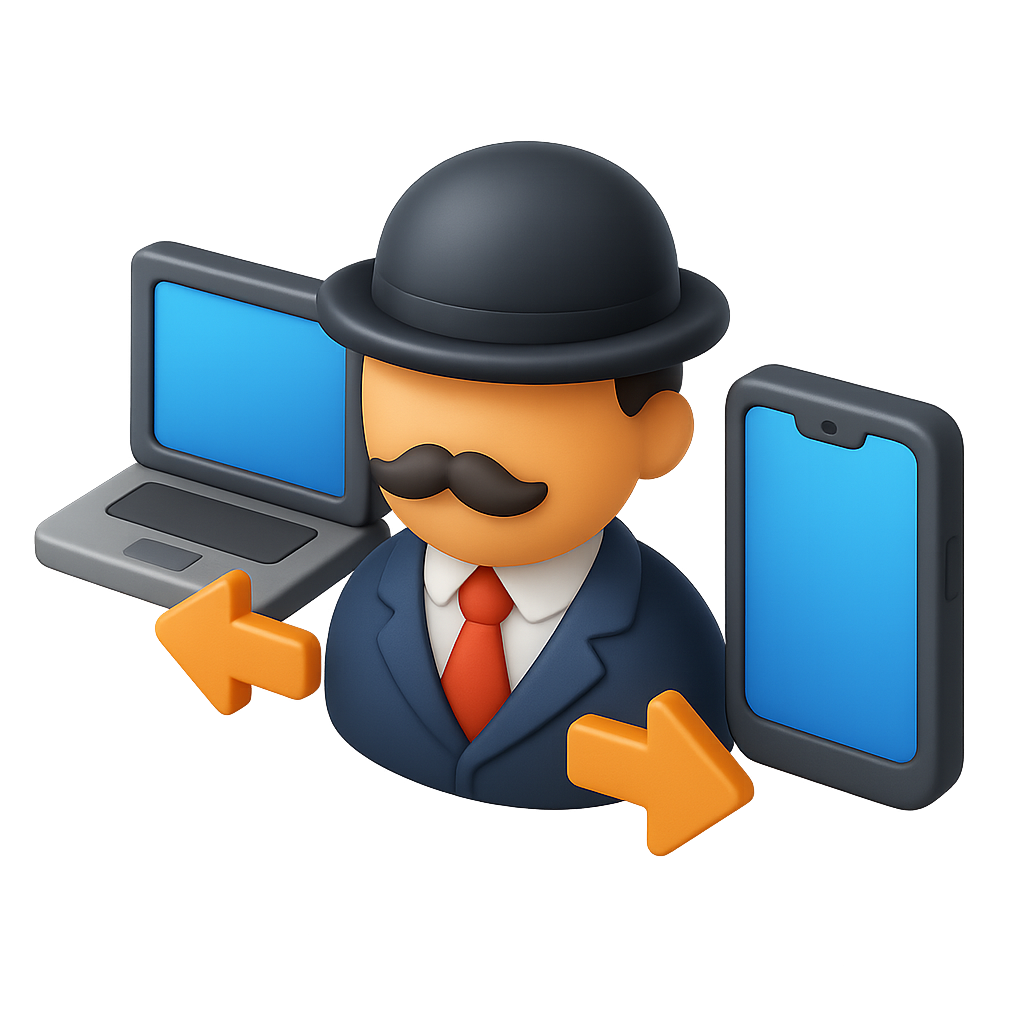 A vibrant 3D isometric icon featuring a character in a suit and bowler hat, flanked by a laptop and a smartphone, all in a three-quarter view.