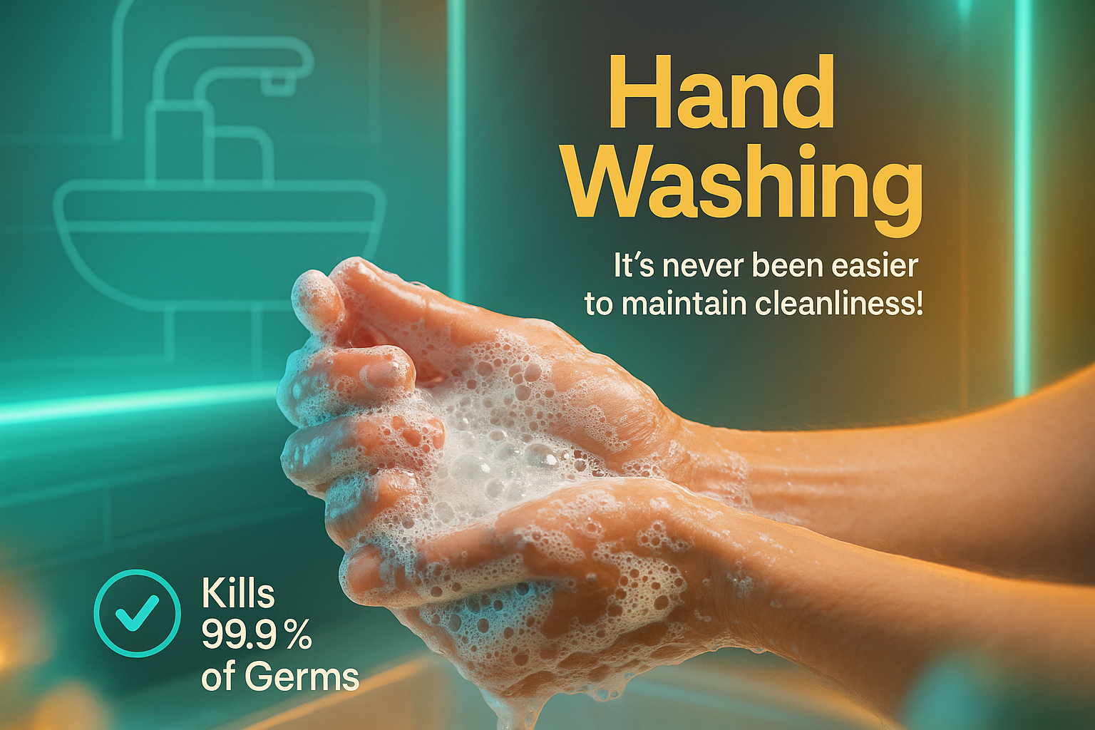 Engaging promotional image emphasizing hand washing benefits, featuring vibrant colors and clean design. Ideal for health campaigns or hygiene education.