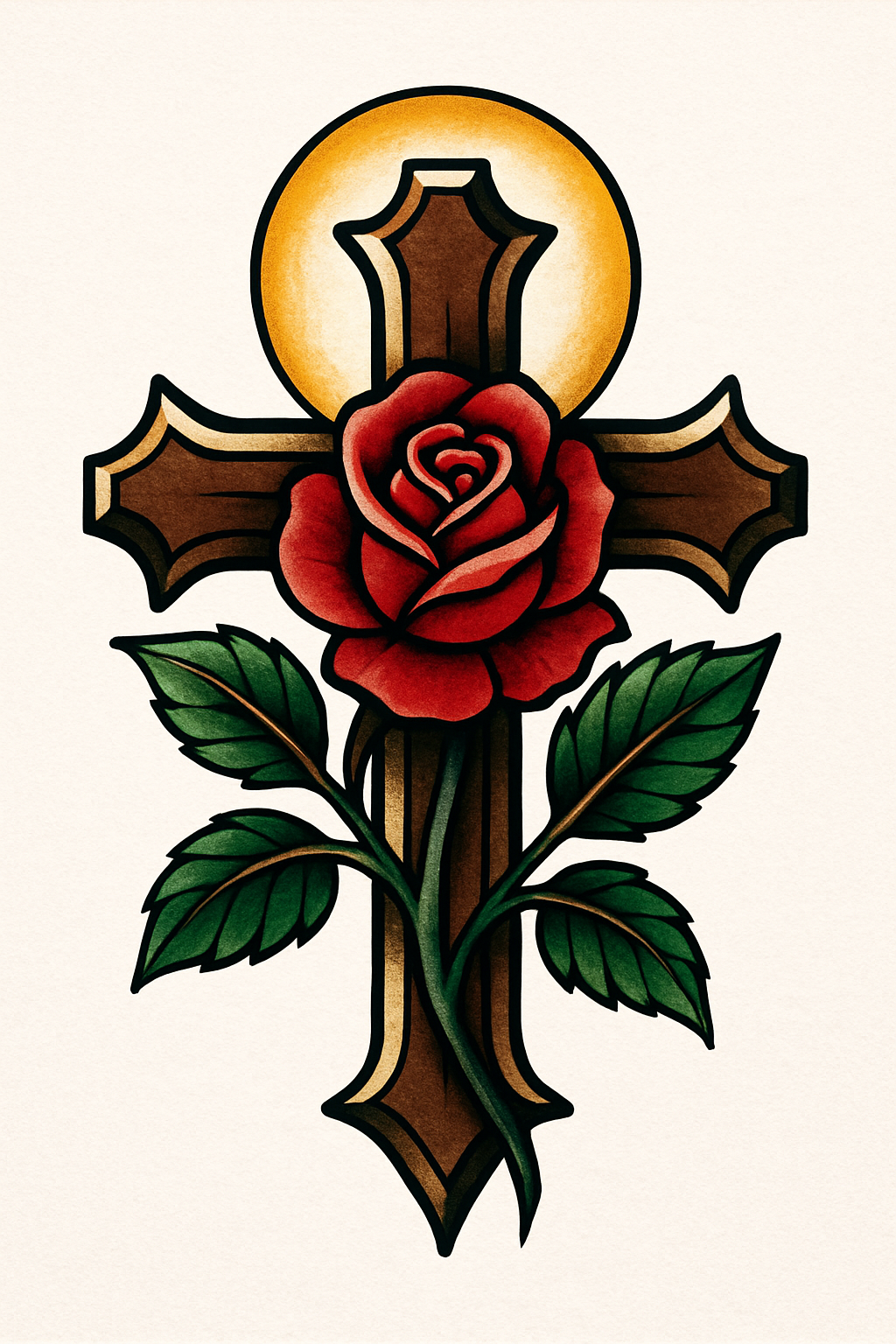 A beautifully illustrated tattoo design combining a wooden cross and a vibrant rose, showcasing a blend of religious symbolism and floral elements, ideal for tattoo enthusiasts.