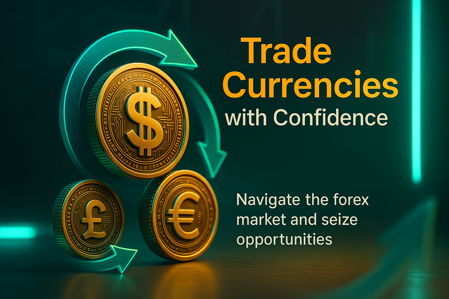 Engaging promotional graphic designed for forex trading, featuring stylized currency symbols and a modern aesthetic, ideal for financial marketing campaigns.