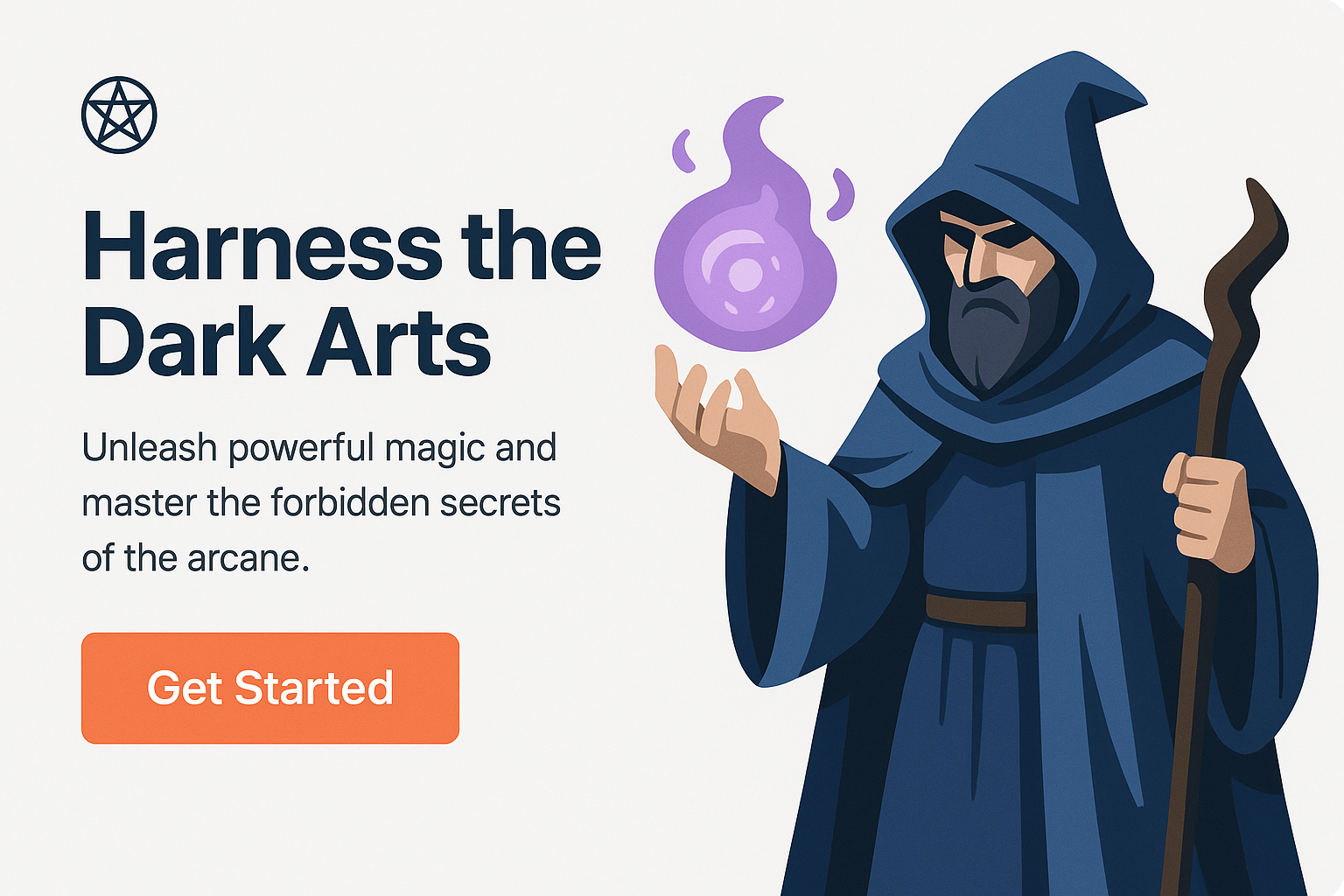 /Collection: /by davooda/Type: PNG/A clean and professional two-column landing page design. The left column features typography and a call-to-action button, while the right showcases a captivating illustration of a warlock.