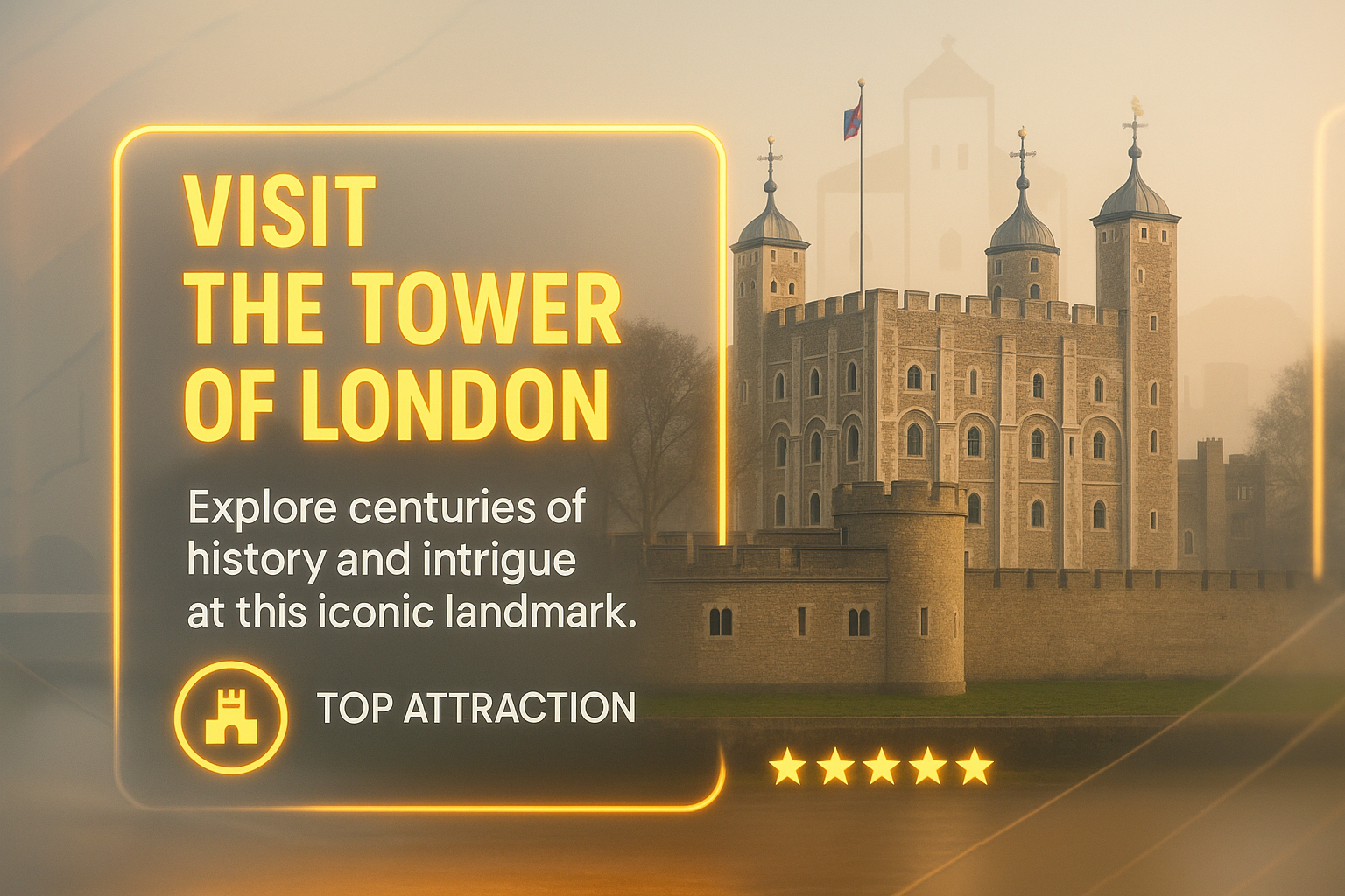 Engaging tourism promotion graphic featuring the Tower of London, highlighting its historical significance and inviting visitors to explore. Ideal for travel marketing.