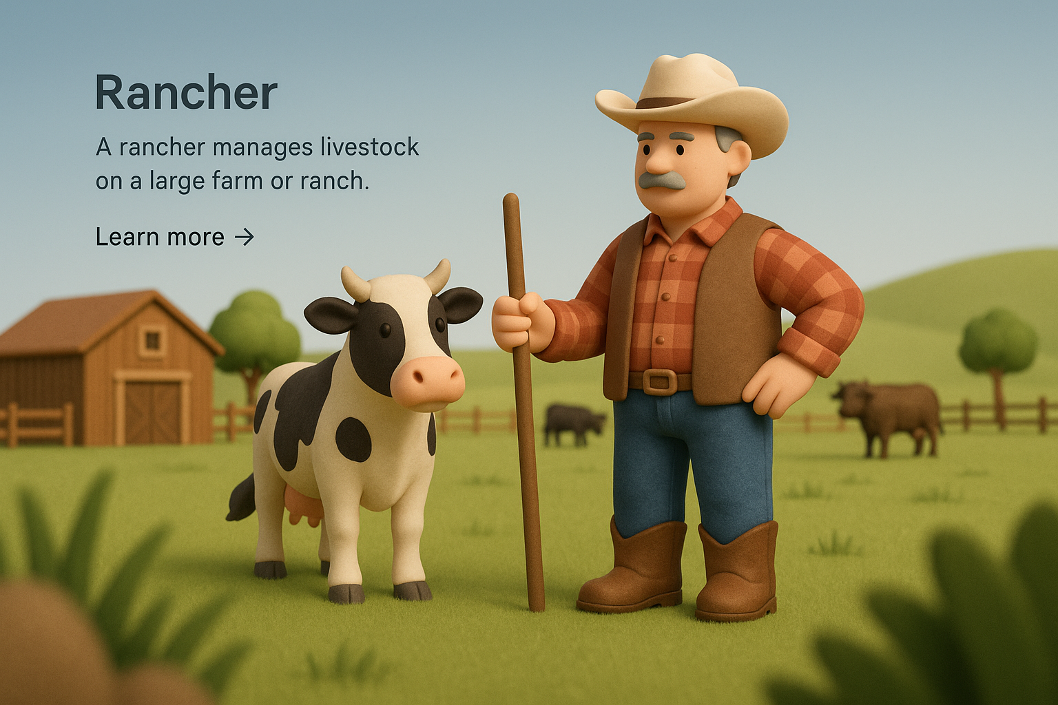 A realistic 3D depiction of a rancher with a cow on a farm, featuring a barn and grazing cattle in the background, highlighting rural life.